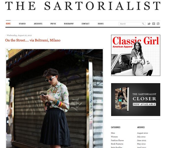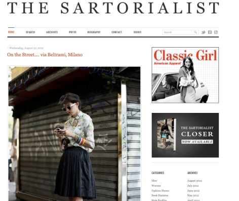 The Sartorialist: el primero, sin duda. Las fotos son geniales y espontáneas, que molan más. Se trata de un fotógrafo, americano, que se pasea en su bici (y aviones, que cambia de ciudad) y su cámara y asalta a anónimos que le llaman la atención. Como novedad, hace poco estuvo por España y colaboró en la campaña de Loewe.