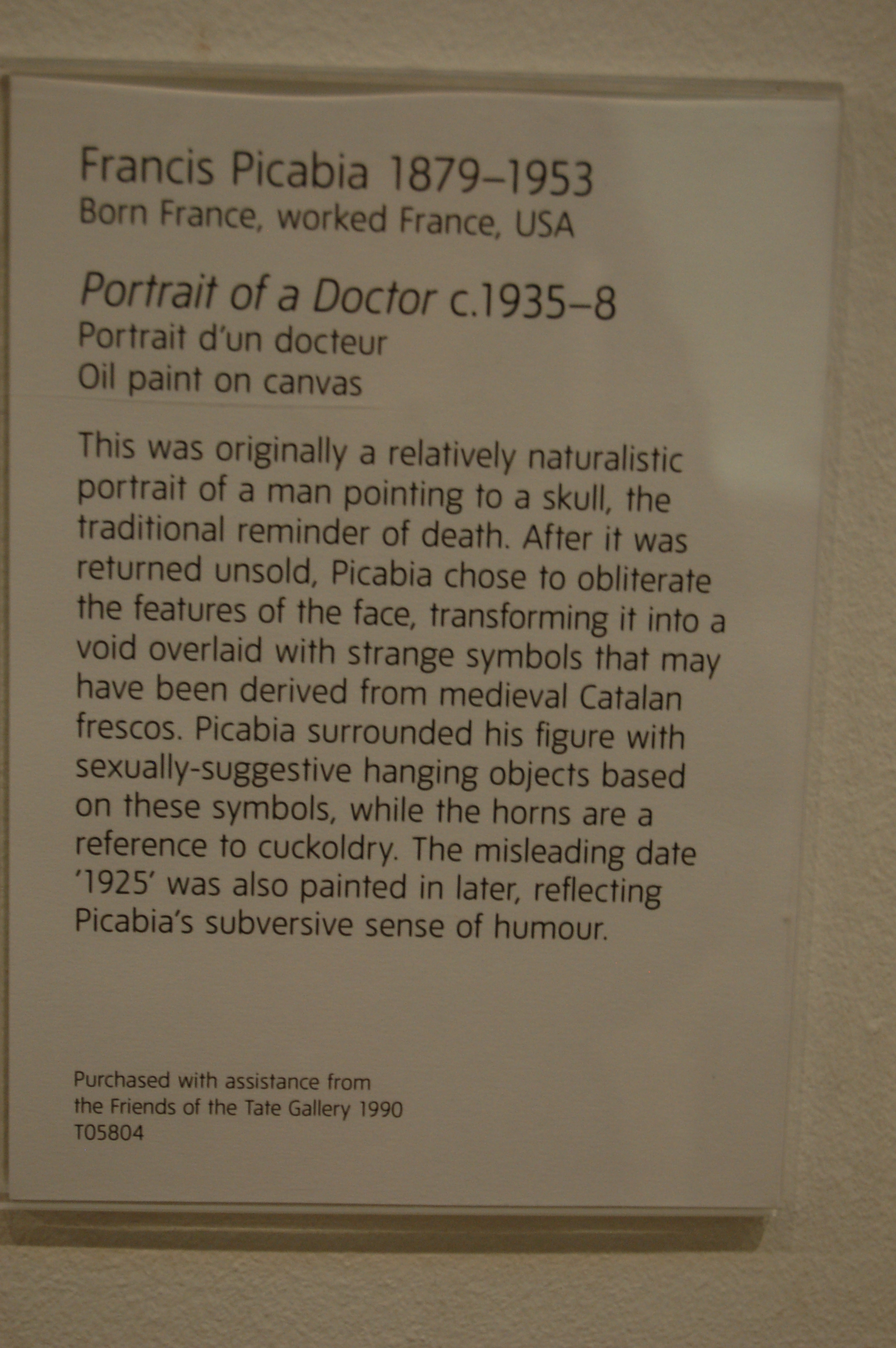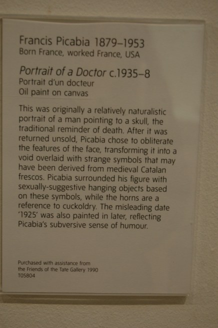 Me llamó la atención este, cerca del de Miró, bien al principio. “Portrait of a doctor” de Francis Picabia. Aunque la foto es mala creo que se puede apreciar bien cómo es un médico… Leer la placa al lado no tiene desperdicio, vamos… jajaja