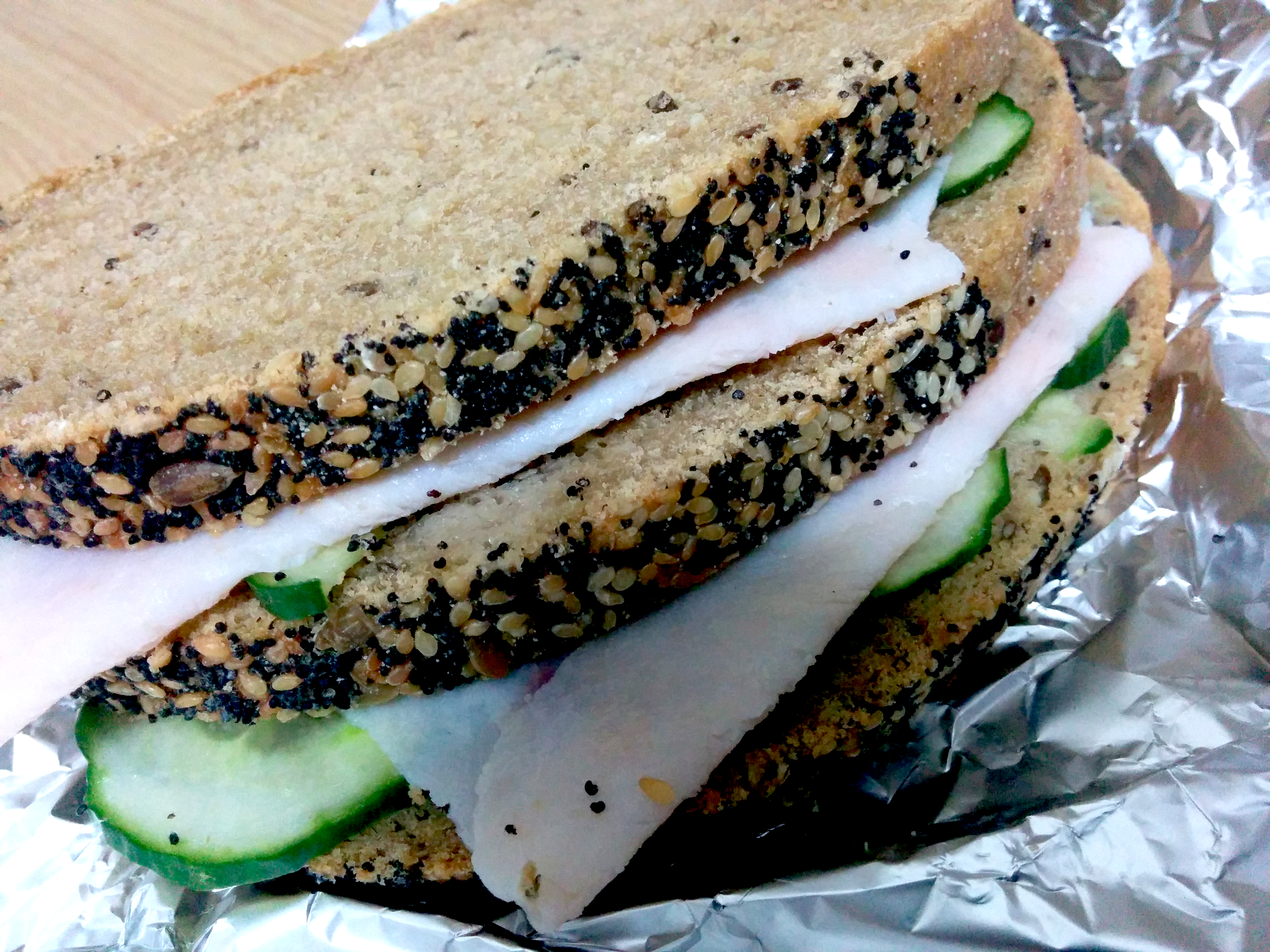 4. Mi increíble bocadillo matutino. Pan integral con miles de semillas de amapola que explotan en la boca, junto con el jugoso pepino y pavo en lonchas que hacen una combinación explosiva en mi boca cuando voy a trabajar en el tren. ¡Qué lujo!