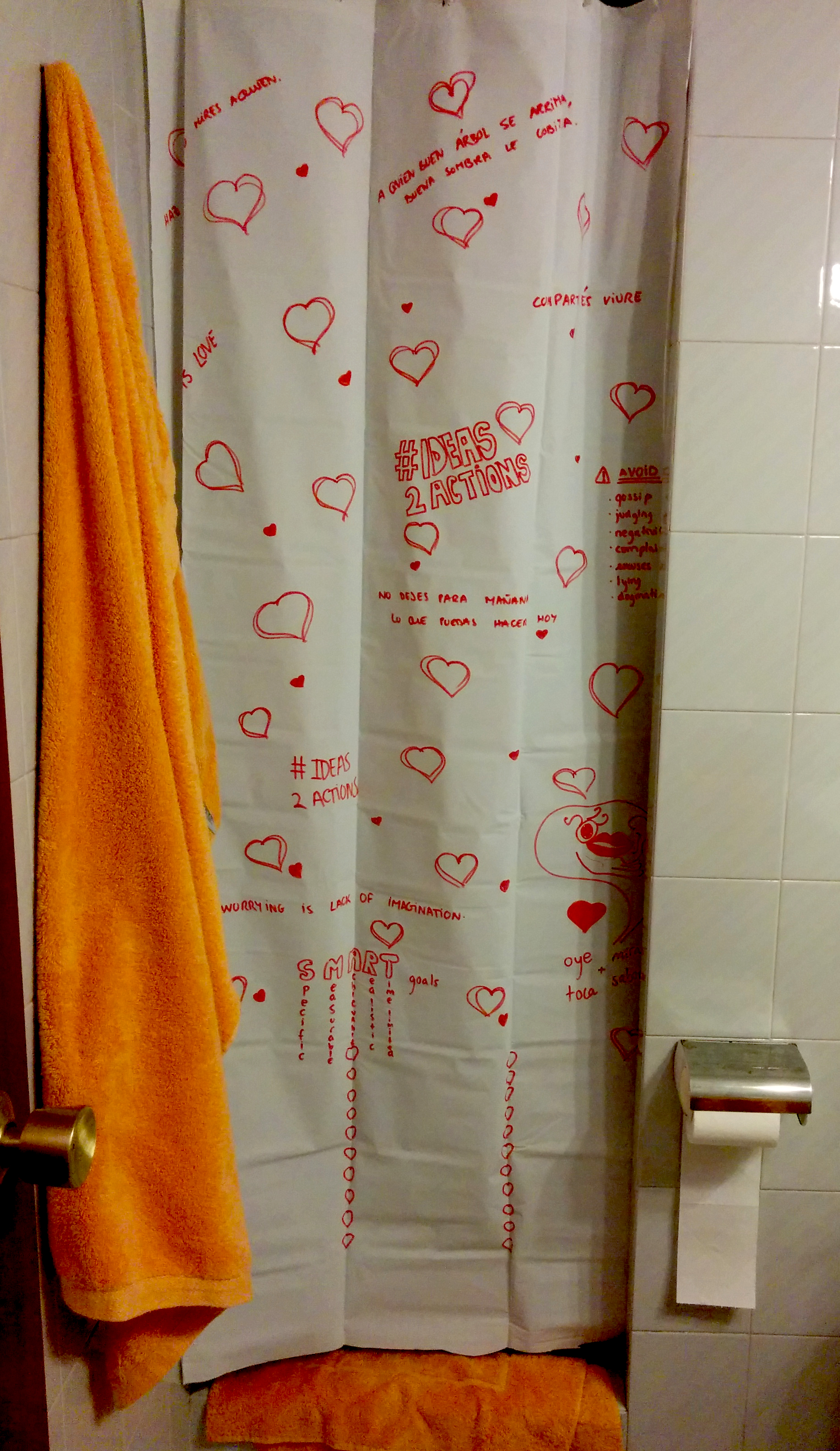 The new curtain for the shower, #DIYpower. Materials needed: white shower curtain from IKEA + red pen + nice quotes to fill your shower time with peace and joy. 🙂