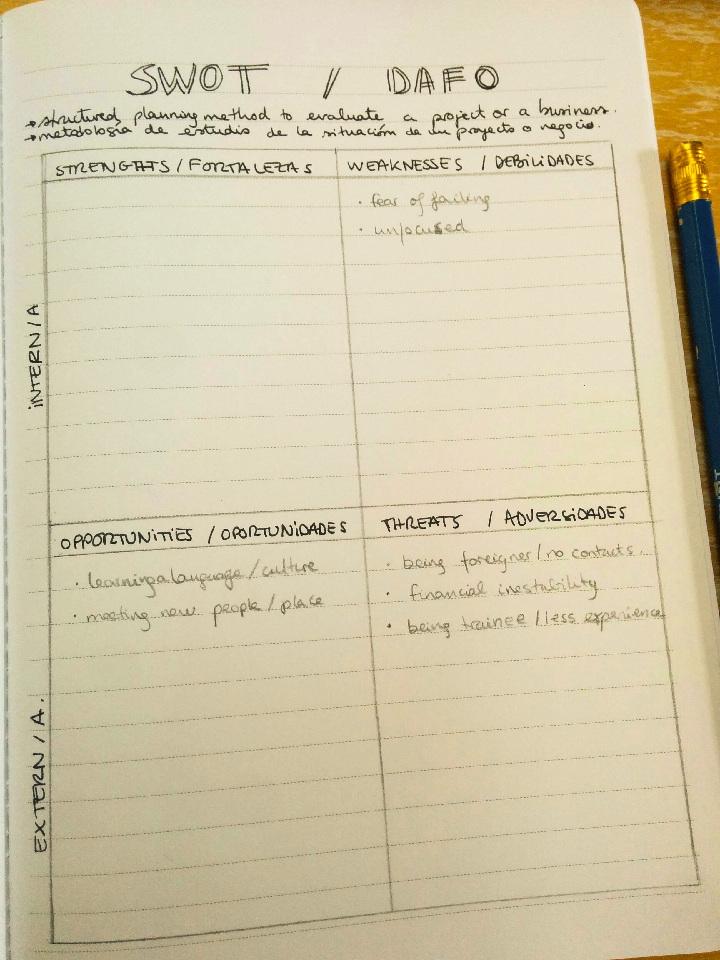 One of the first things I wrote was a SWOT, a structured planning method to evaluate a project or a business, considering its internal (strenghts and weaknesses) and external (opportunities and threats) characteristics. A good friend of mine taught me what it was and we did it for her. I found it a great tool to set a start because, at the end of the day, my life is my own project or business, isnt’ it?