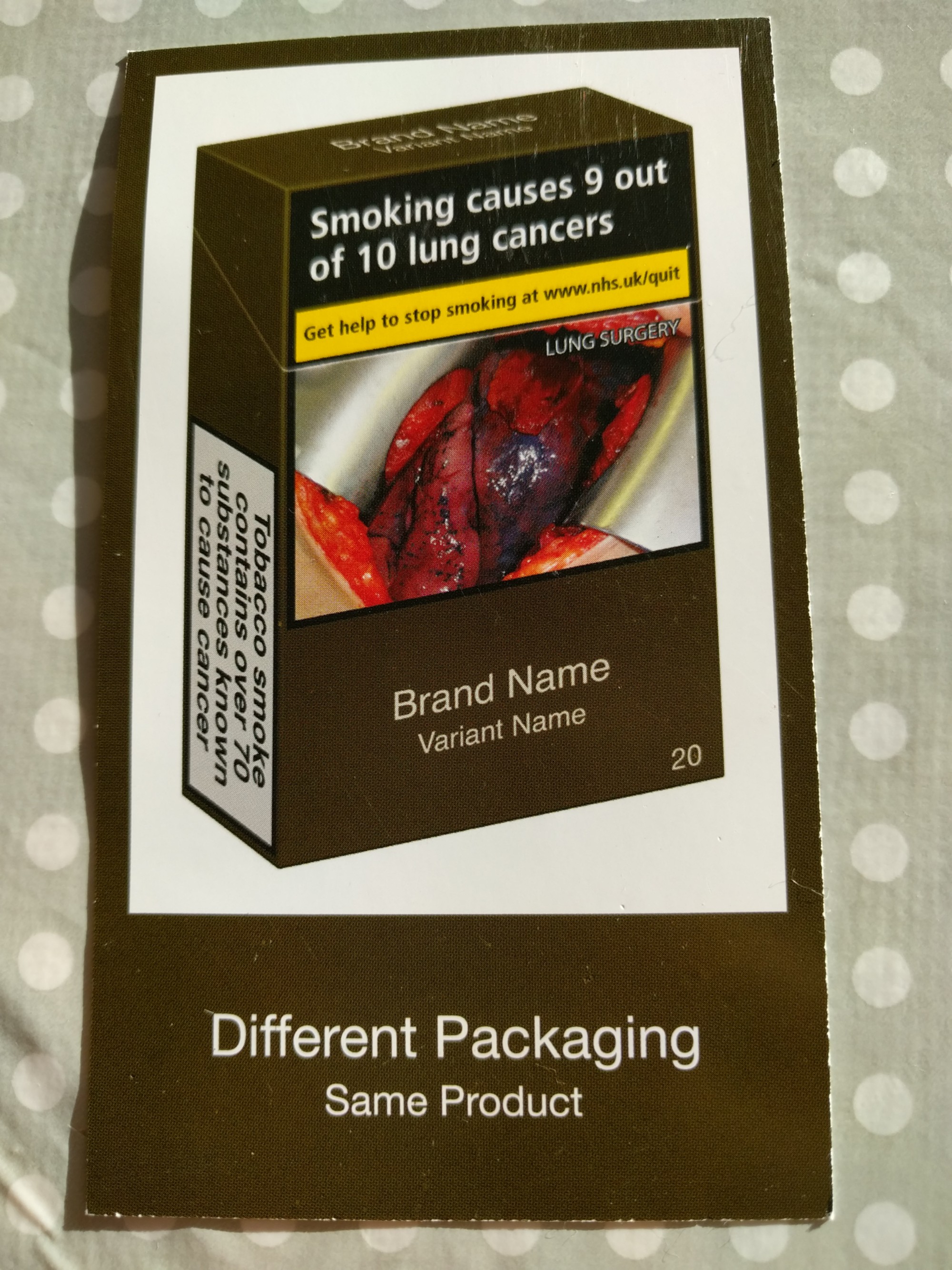 - Standardised packaging: all cigarette and hand rolling tobacco packs will be in the same olive green colour.